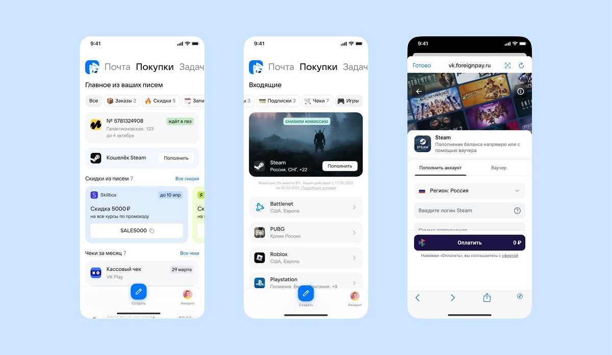 В Почте Mail теперь можно оплачивать Steam и другие цифровые товары