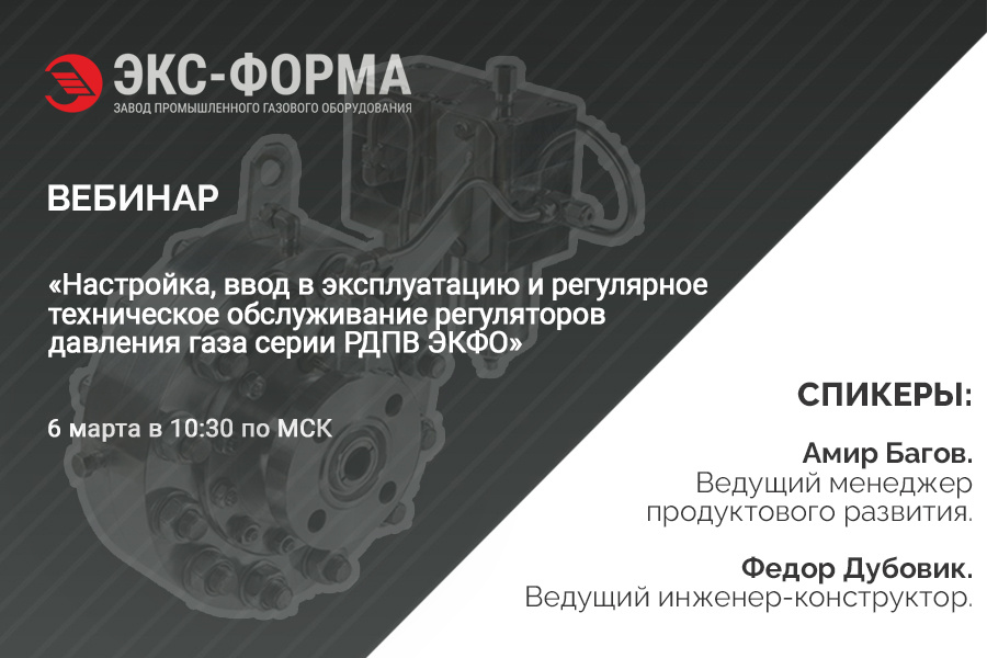 6 марта 2025 года приглашаем вас принять участие в бесплатном вебинаре от ПКФ «Экс-Форма» на тему: "Настройка, ввод в эксплуатацию и регулярное техническое обслуживание регуляторов давления газа серии РДПВ ЭКФО" Вебинар будет полезен руководителям и специалистам службы эксплуатации, занимающихся монтажом, эксплуатацией и техническим обслуживанием газового оборудования. В ходе вебинара наш ведущий инженер-конструктор ознакомит участников с устройством и особенностями ввода в эксплуатацию регулятора давления газа серии РДПВ ЭКФО, предназначенного для работы в сетях газораспределения с номинальным давлением до 10 МПа. Запланированная обучающая сессия может быть использована в качестве эффективной площадки для коммуникации специалистов служб эксплуатации с заводом-изготовителем. Участники получат возможность задать вопросы в ходе вебинара, а также обсудить интересующие проблемы, с которыми сталкиваются специалисты в ходе эксплуатации оборудования. Спикер вебинара: Амир Багов - ведущий мене