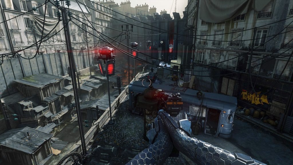 Это прямое продолжение The New Colossus. Действие разворачивается на улицах Нового Парижа в альтернативных восьмидесятых, где Третий Рейх все еще контролирует Европу. У нас тут немецкий синти-поп, плакаты и видеокассеты, с нацистским уклоном пародирующие известные фильмы той эпохи, игровые автоматы с арийскими вариантами «Пэкмэна» и самой Wolfenstein (называется Elite Hans, можно даже поиграть). Кринжово, иногда смешно, иногда жутко, на погружение работает отлично. Уровень Far Cry 3: Blood Dragon и даже выше.