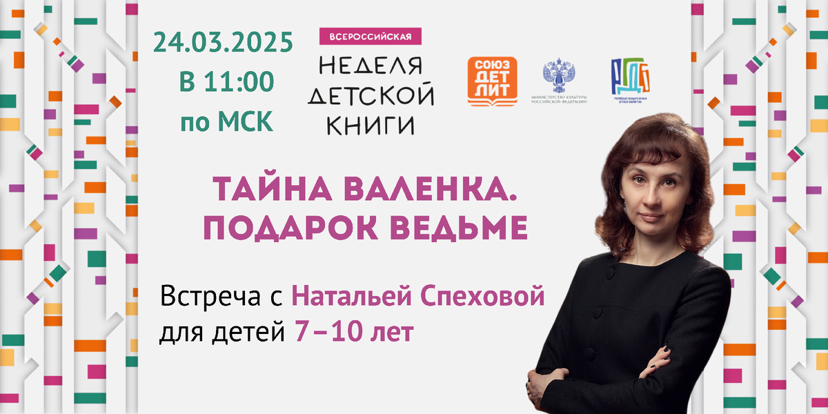 24 марта в 11:00 пройдет интерактивная встреча «Тайна валенка. Подарок ведьме» с детским писателем, психологом, педагогом и литературным блогером Натальей Спеховой. На встрече ребята познакомятся с историей валяния, узнают интересные факты, поиграют с гостьей и узнают больше о книге «Подарок ведьме». Предлагаем познакомиться с автором поближе.