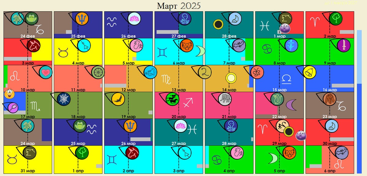 На моих лунных ковриках отмечены: • луна в знаках зодиака • фазы луны (новолуние, полнолуние, четверти) • лунные дни • луна без курса ("люди в собственном соку", меньше слышат других) • апогеи и перигеи луны • ретро-меркурий (синяя вертикаль по правому краю) см.легенду