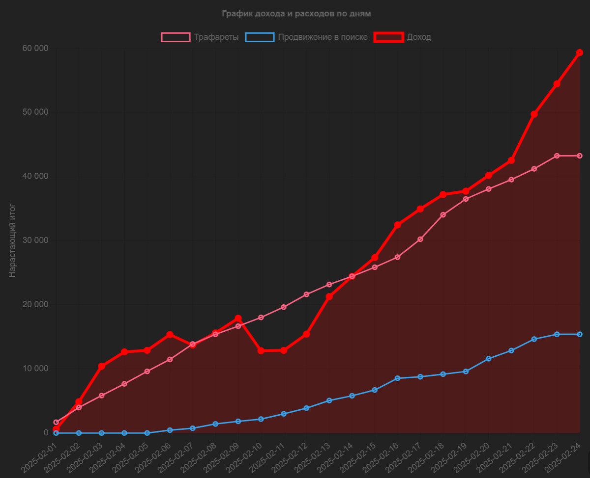 Добавил нормальный график в приложение для расчёта прибыли Ozon. Теперь можно смотреть любые статьи расхода во времени. Такие доступны поля: 1) Стоимость товаров с учётом скидок продавца - Доставка покупателю 2) Итоговая сумма операции - Доставка покупателю 3) Комиссия за продажу или возврат комиссии за продажу - Доставка покупателю 4) Доставка покупателю - Расход 5) Закупочная стоимость 6) Оплата эквайринга 7) Кросс-докинг 8) Доставка и обработка возврата, отмены, невыкупа 9) Трафареты 10) Услуга по бронированию места и персонала для поставки с неполным составом в составе ГМ 11) Обработка сроков годности на FBO 12) Продвижение в поиске 13) Получение возврата, отмены, невыкупа от покупателя 14) Доставка покупателю — отмена начисления 15) Подготовка товаров к возврату 16) Вывоз товара со Склада силами Ozon: Доставка до ПВЗ 17) Утилизация товара: Повреждённые, были у покупателя 18) Утилизация товара: Повреждённые из-за упаковки 19) Подписка Premium 20) Сумма расходов 21) Доход Можно зате