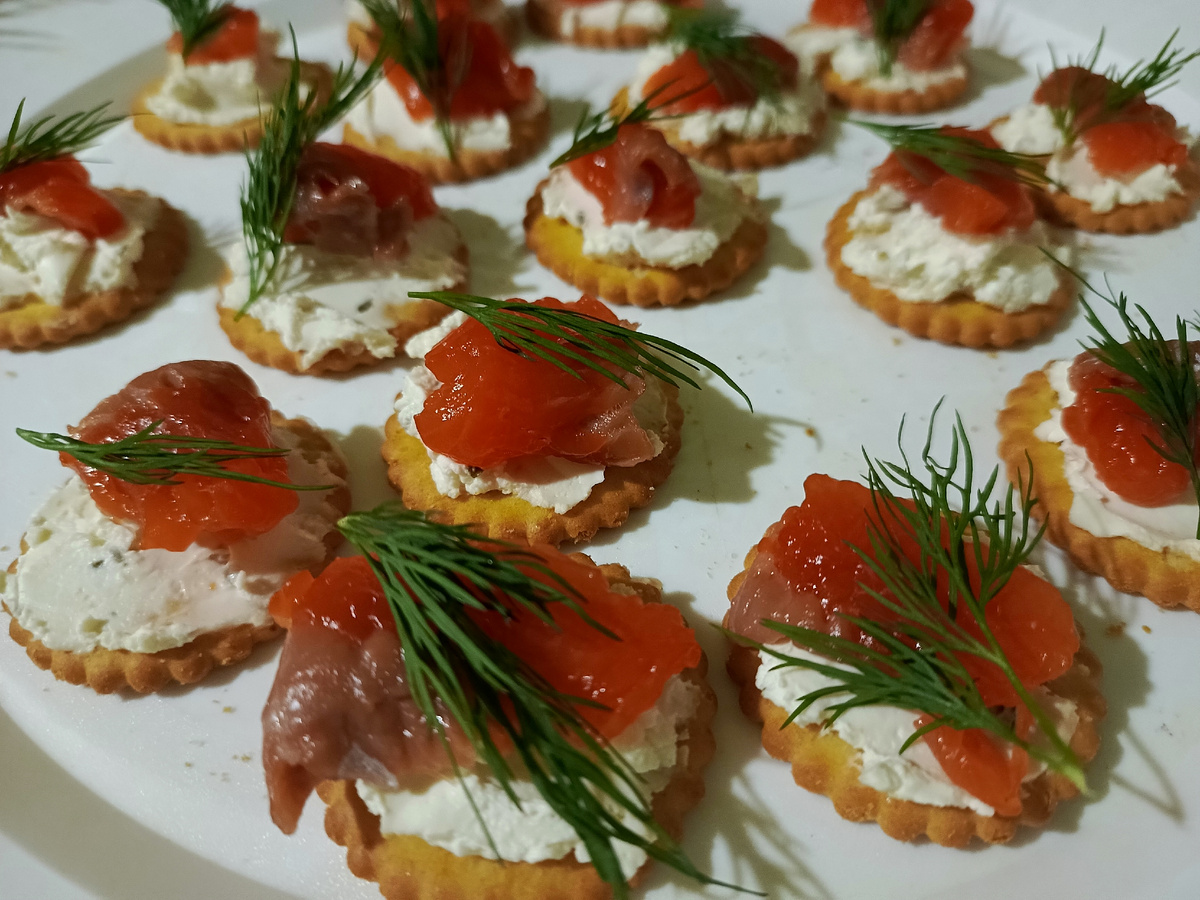 Каждый крекер смазываем любым сливочным сыром, на сыр выкладываем кусочек красной рыбки, украшаем веточкой укропа. Вкусно, быстро и просто😉