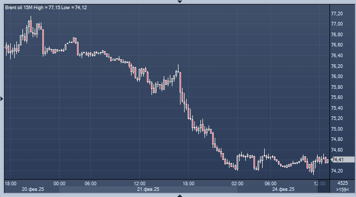 Ожидается, что экспорт по трубопроводу Ирак-Турция вскоре возобновится. Конфликт на Украине остается в центре внимания. Поставки российской нефти будут по-прежнему ограничены политикой ОПЕК+ График цены нефти марки Brent интервалами в 15 минут В понедельник стоимость нефти продолжила снижаться, следуя тенденции прошлой недели. Инвесторы ожидают ясности в переговорах о прекращении конфликта на Украине и оценивают перспективы возобновления экспорта сырой нефти из северного Ирака. К 08:43 по Гринвичу фьючерсы на нефть марки Brent подешевели на 14 центов, или на 0,2%, до $74,29 за баррель. Фьючерсы на американскую нефть марки West Texas Intermediate потеряли 21 цент, или 0,3%, до $70,19. В пятницу цены на нефть марок Brent и WTI упали более чем на 2 доллара, зафиксировав недельное снижение на 0,4% и 0,5% соответственно. Все внимание приковано к попыткам положить конец украинскому конфликту, который в понедельник вступает в четвёртый год. В воскресенье официальные лица заявили, что лидеры Е