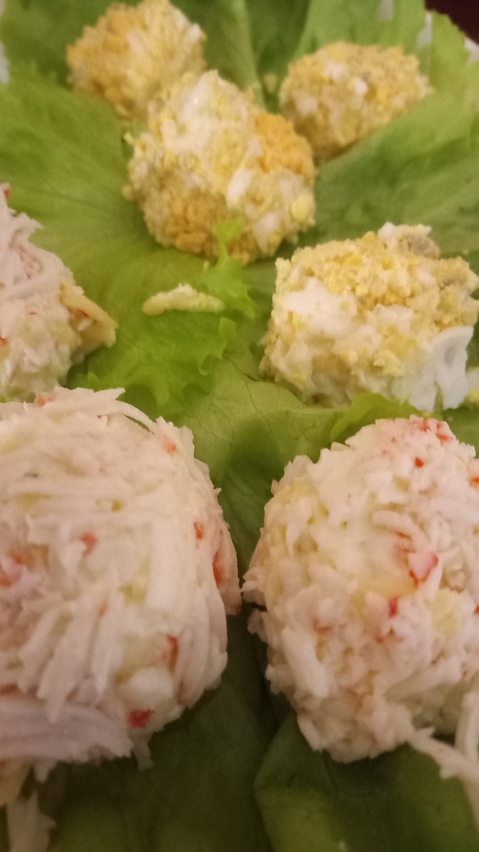 Сыр трем в терку. Вареные яйца разделяем на желток и белок. Белок трем в терку и добавляем к сыру. Сюда же добавляем чеснок и майонез. Делаем из смеси шарики. Желток и крабовые палочки трем в мелкую терку. Каждый шарик из смеси обваливаем в желтке или крабовых палочках. Получается два вида шариков. Подаем на листьях салата.