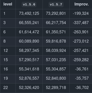 В таблице по уровня везде видим изменения. Без пропусков. Но самое интересное кроется здесь: Помимо улучшения 22 уровня, в релизе 1.5.7 добавили параметр max. Разница с 22 уровнем космическая, но что если борьба за каждый процент и время не важно? За тест был взят ISO от PSP игры, которые очень часто недожаты. Сравнение: И в последнем результате кроется ключевое, почему это не проходное обновление. Я с 7z игрался и с размером слова, и с размером словаря, но результат гулял в 2-4МБ и особо не менялся. Т.е. в моём случае и в тесте с данным ISO Zstd 1.5.7 вышел лидером по сжатию, и это впервые за все мои тесты когда 7z уступил этому относительно молодому детищу Facebook. И в целом по моему опыту 7z только несколько раз уступил ZIP сжатию, и может уступать сильно настроенному RAR.
