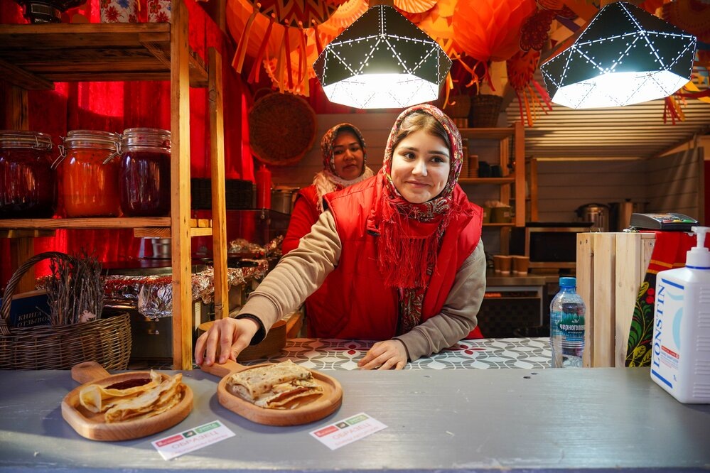 "Главное угощение Масленицы – это блины. Всего в меню фестивальных площадок представлено более 50 видов блинов. Это и традиционные русские блины со сметаной, медом, вареньем, сгущёнкой, и блины по-сибирски с муксуном, по-московски с красной икрой, блины с крымской лавандой, с пломбиром и апельсиновым соусом, кукурузные блины с сыром и вишневым вареньем. В общем, блины у нас на любой вкус",