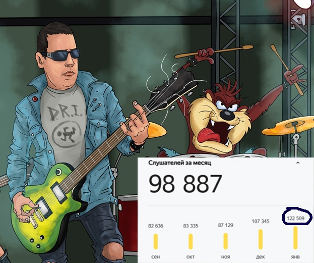 Мы не из тех, кто гонится за статистикой и цифрами. Однако, ими нельзя пренебрегать. Ещё пару лет назад у нас были очень и очень скромные показатели. При этом мы продолжали делать любимое дело, сочиняя песни. Насочиняли достаточно много. Много ещё такого, чего мы даже не выпустили (но планируем). В этой всей творческой вакханалии мы как-то упустили то, что смогли на Яндекс.Музыке побить свои рекорды по количеству слушателей в месяц (январь 2025 года). 122 509 человек. Штош, для нас это очень приятные цифры. Как оно иногда бывает, сейчас наблюдается спад. Но мы намерены дальше покорять новые высоты. Вот, например, ты уже послушал новый альбом? Торопись, уже не за горами свежие синглы и альбомчики.