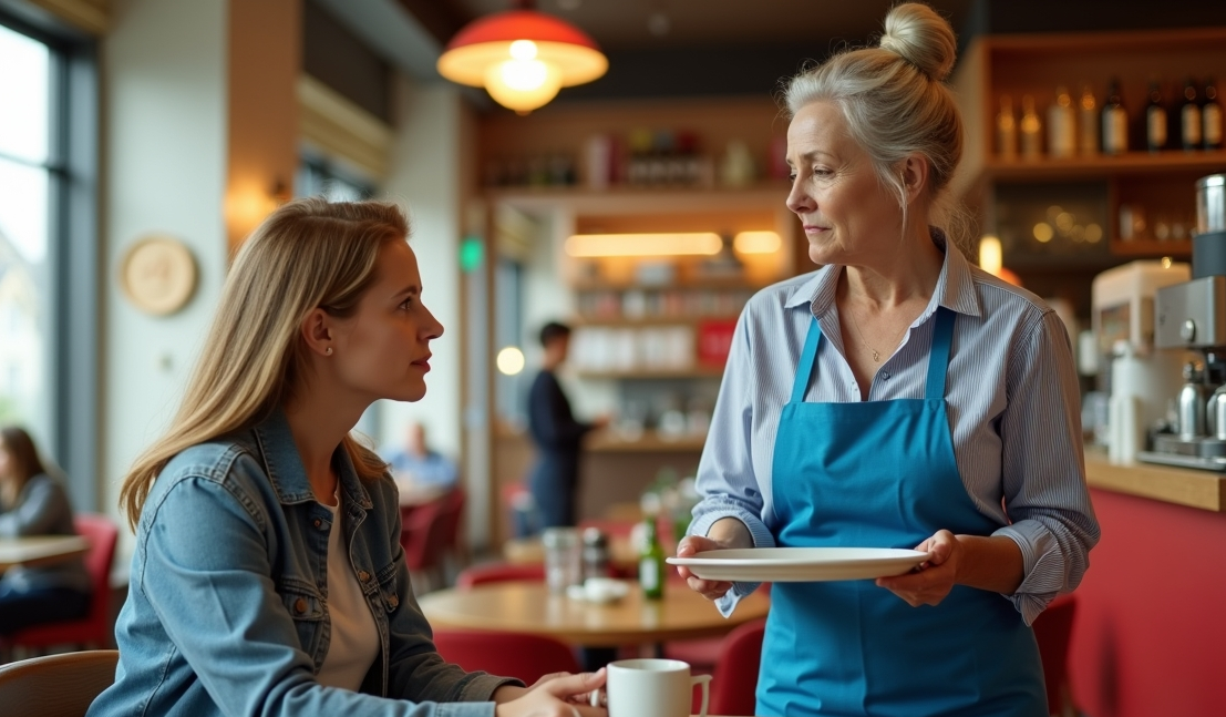Через неделю напряжение лопнуло. Галина поднос с тарелками несла — суп, салат, кофе. Споткнулась у четвёртого столика, всё на пол грохнулось, суп по плитке растёкся, ложка звякнула. Клиенты зашумели, я встала, внутри всё кипело.