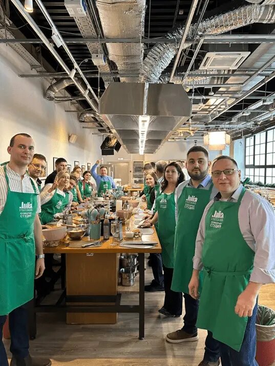 Декабрь – время, когда хочется выдохнуть и расслабиться. Кварталы закрываются, итоги года подводятся, работа кипит и, к сожалению, часто происходит так, что многие вымотаны до последней капли. Все куда-то бегут, а хочется человеческого «отдохнуть». Это чувство как никто другой знают сотрудники компании «Эталон Бэттери», поэтому в пятницу, 20 декабря, наша команда собралась отправиться в так называемый «ретрит». С утра пораньше мы встретились в студии Юлии Высоцкой, чтобы, наконец, научиться готовить. Хотя, честно сказать, многие уже что-то умели)). В любом, случае варить макароны или готовить тесто самостоятельно – разные вещи. Итак, в меню у нас были заявлены: паста «карбонара», салат с клубникой и артишоками, а также крамбл с вишней. Надежда было на то, что никто в этот день не отравится. Мы были бы не мы, если бы не начали свое утро с бокала «Просекко» – это помогло нам раскрепоститься. Волшебный игристый напиток сопровождал нас с утра и до самого конца корпоратива, - и мы были не п