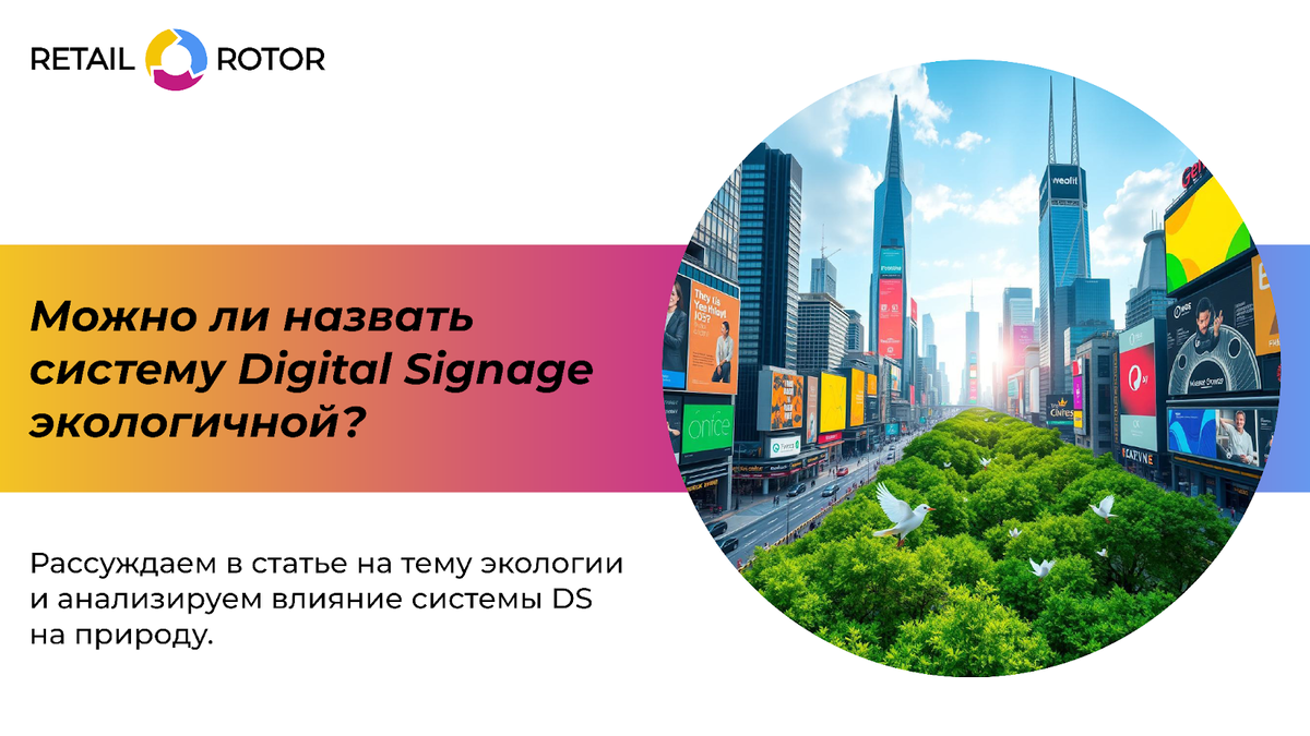 В свою очередь, система Digital Signage позволяет значительно уменьшить негативное влияние на природу. Во-первых, в сравнении с традиционными POS-материалами использование экранов уменьшает объёмы вырубки лесов и тем самым сохраняет экосистемы. Таким образом, если пользоваться экранами вместо печатных материалов, можно значительно сократить выбросы углерода, связанные с транспортировкой и утилизацией печатных материалов. Во-вторых, экраны позволяют снизить количество мусора и прочих отходов, поскольку бумажная продукция имеет короткий жизненный цикл и быстро превращается в мусор.