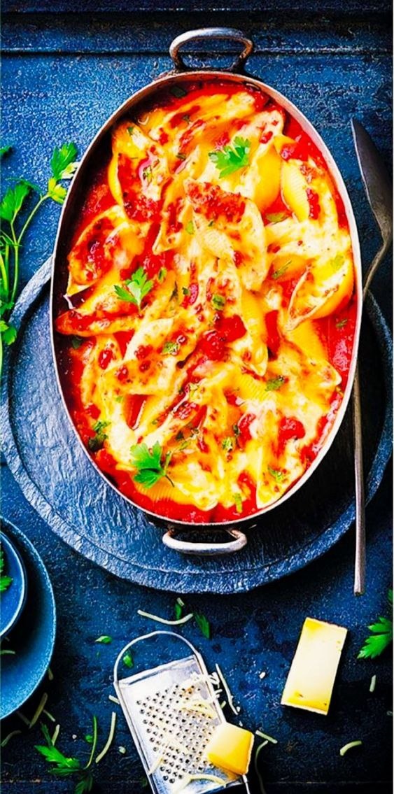Предлагаю вам приготовить это вкусное блюдо из больших макаронных ракушек, называемых конкильони. Вам потребуется. Конкильони большие - 28 штук Морковь, лук, стебель сельдерея - по 1 штуке Чеснок - 2 зубка Тимьян - 4 веточки Мясной фарш - 125 грамм Томатное пюре - 700 грамм Сыр (2 разных сорта) - 150 грамм или больше Молоко - 250 мл Сливочное масло, жирные сливки, соль, перец, мускатный орех, любые другие специи по вкусу. Способ приготовления. Порежьте мелкими кусочками очищенные морковь, лук, чеснок и веточку сельдерея. Обжаривайте овощи в сковороде на слабом огне со сливочным маслом примерно 10 минут. Добавьте фарш и готовьте на сильном огне 5 минут, периодически помешивая. Затем положите томатное пюре, молоко, сливки, тимьян, соль и перец, перемешайте и варите на слабом огне. Нагрейте кастрюлю с подсоленной водой. Как закипит - положите в неё конкильони, варите половину времени, указанного на упаковке. После приготовления слейте воду и промойте их холодной водой. В миске смешайте