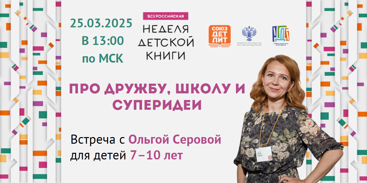 25 марта в 13:00 состоится встреча «Про дружбу, школу и суперидеи» с детским писателем Ольгой Серовой. Ребята поговорят о дружбе, школьной жизни, заботе о природе и обсудят, кому чаще приходят в голову супер идеи — детям или взрослым. Предлагаем познакомиться с автором поближе.