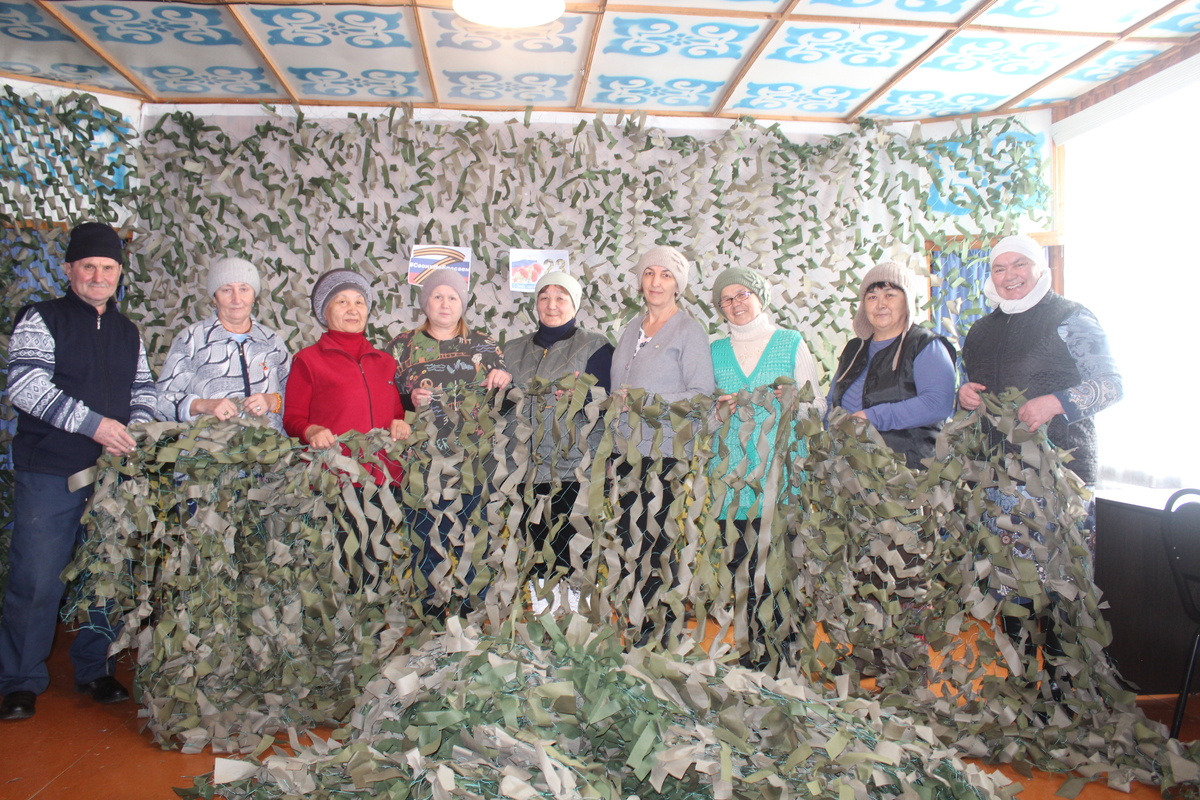 Активисты, неравнодушные люди, в том числе родители и родственники военнослужащих д.Верхнебиккузино изо дня в день трудятся над созданием маскировочных сетей, что широко применяются для укрытия бойцов, военной техники и других объектов в зоне СВО, которые потом отправляют в районный центр (пока 17 штук). Запрос на них очень большой, их регулярно поставляют в зону СВО.
