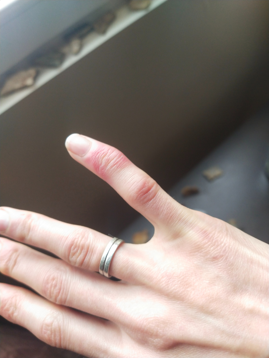 Так, смотрите. Это не ожог, не инфекция кожи, даже не обморожение. Холодовой дерматит связан с холодом, но не обморожением. Поразить может щеки, ступни, кисти, суставы. У меня с детства обычно пальчики на ногах и кисти. Ноги бы не стала фотографировать - это совсем интимно, а руку могу. При холодовом дерматите пораженный участок краснее , отекает, кожа становится горячей. Но "горячесть" волнами, то накатывает, то спадает. Могут появиться небольшие узелки и "пупыры" - как у детей проявляется дерматит на щечках. Запаха, как у инфекции - нет. В отличие от ожогов - нет влажности. Суставы не болят, сгибаются, не щелкают, но от отека может ощущаться некоторое давление на сустав, особенно мелкий. Но вот именно "серединка" в поврежденном пальце не должна болеть. По ощущениям - не очень болит, но волнами неистово чешется. После прохождения острой фазы кожа становится очень сухой, может потрескаться, потом облезать (вот такое фу). Отек может сохраняться несколько дней, но не выходя за гран