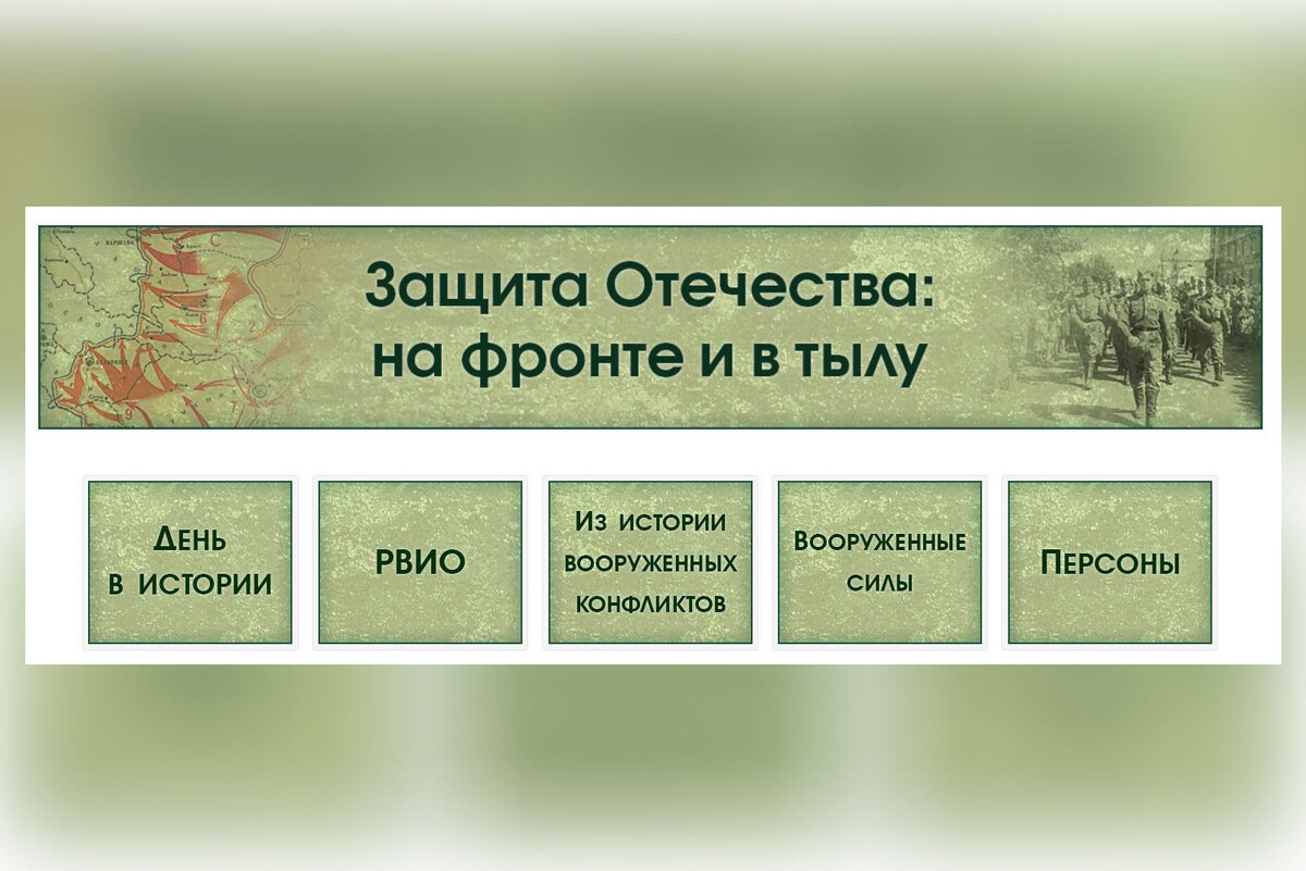 «Защита Отечества: на фронте и в тылу» включает цифровые коллекции и записи видеолекций по военно-исторической тематике, виртуальные туры, биографические материалы. Особое внимание уделено деятельности Российского военно-исторического общества.