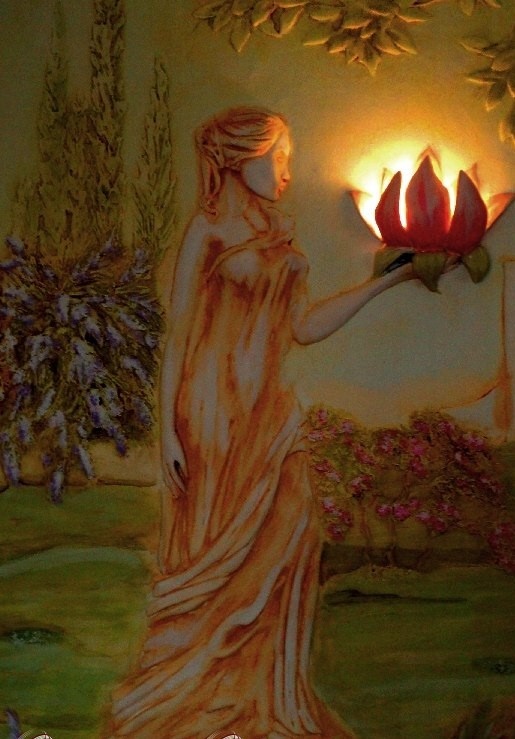 В самом начале моей творческой деятельности мне сделали этот заказ. Интересно, что "камни" уже были выполнены до меня, и хозяева этого дома хотели заполнить свободное пространство, создав эффект перспективы и сада, уходящего в даль, за каменной стеной. По камням они тоже хотели пустить немного веток лиан, чтобы оживить их. Я, как обычно, создала несколько вариантов эскизов, и принялась реализовывать тот, который выбрали. Как обычно, я предлагала монохром, который смотрелся бы более гармонично, и менее навязчиво, но заказчики настаивали на выполнение покраски в цвете, при чём, ярком. Что же... Хозяин-барин. Даже если нужна покраска в цвете, можно использовать более реалистичные и приглушённые тона, что я и сделала в этом случае. На фото ниже, пожалуй самая реалистичная цветопередача. Оттенки охры, немного зелёного, и небольшие акценты розовым. В целом вышло довольно гармонично. На эту работу у меня ушло примерно три недели. Но... Тогда мои темпы оставляли ожидать лучшего. Сейчас я сде