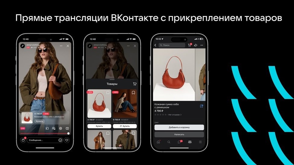 Владельцы и администраторы бизнес-сообществ ВКонтакте могут проводить прямые эфиры в мобильном приложении и добавлять в трансляции товары. Во время стрима зрители увидят их в виде плашек с фото, названием и ценой продукта.