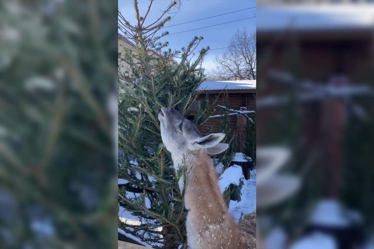 Петербуржцам показали, как гуанако Афина из Ленинградского зоопарка лакомится еловыми веточками