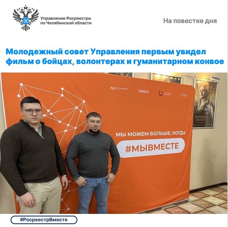 Молодежный совет Управления первым увидел фильм о бойцах, волонтерах и гуманитарном конвое 24 февраля 2024 года члены Молодежного совета Управления Росреестра о Челябинской области посетили премьерный показ фильма «Большой…Гуманитарный», приуроченный к празднованию Дня защитника Отечества. Мероприятие было организовано волонтерским движением #МЫВМЕСТЕ в рамках проекта Всероссийской программы «ГосСтарт» по направлению «Доброслужащий» с целью вовлечения государственных и муниципальных служащих в волонтерскую и социально направленную общественную деятельность. Показ фильма «Большой…Гуманитарный» состоялся сегодня в Челябинске в кинотеатре «Знамя». На премьере побывали и сотрудники Управления Росреестра. Документальный фильм о гуманитарном конвое и людях, ставших волонтерами по зову сердца, собрал полный зал. Главная сюжетная линия - это история длиною в два с половиной года: путь магнитогорского гуманитарного конвоя и одного мобилизованного жителя Магнитогорска. Все вышедшие из кинозала з