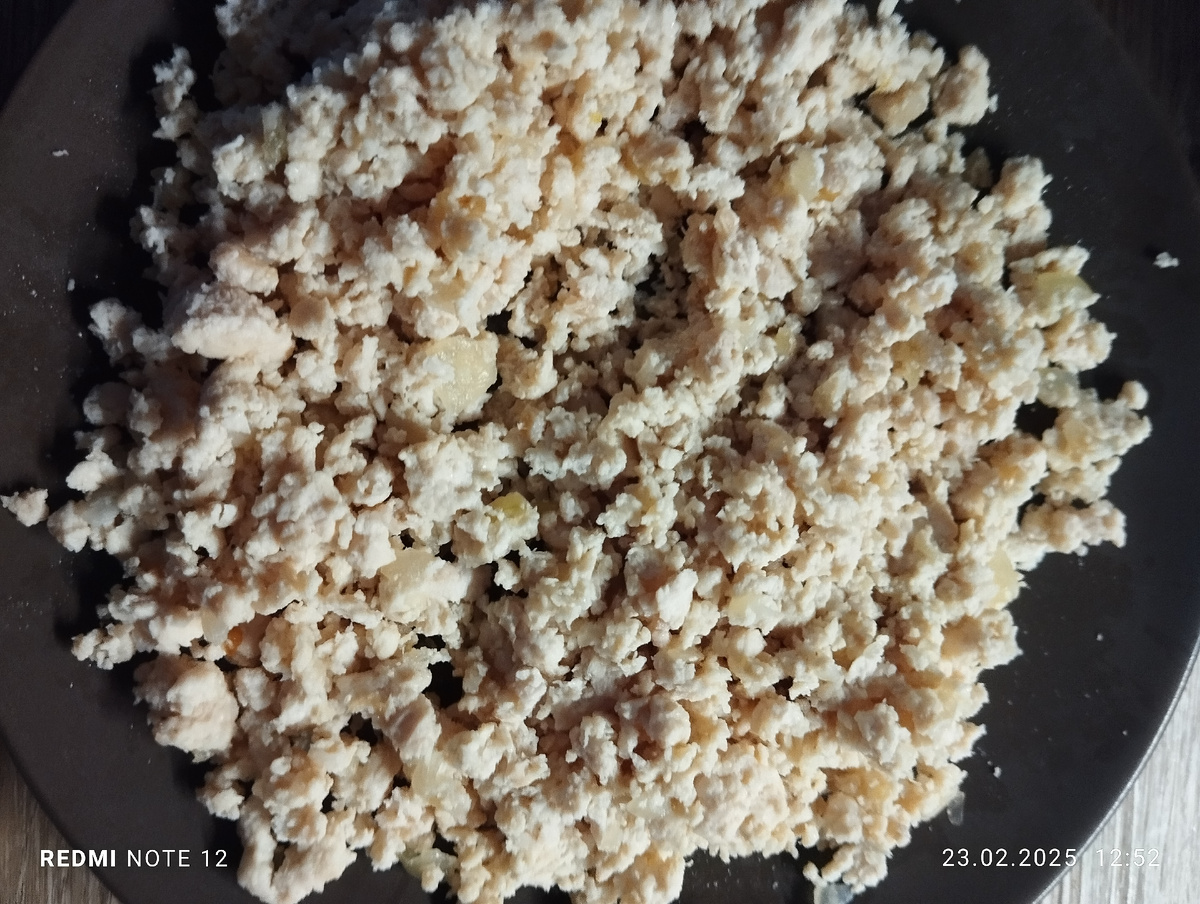 - Добавляем в тесто наш обжаренный фарш, и перемешиваем: