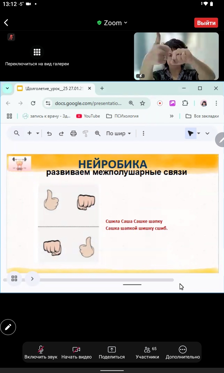 Всем привет! С Вами Татьяна, пенсионерка. Мне 73 года, рост 151 см, вес 56,8 кг, за 2023-24 год сбросила 25 кг с веса 82 кг. Мои онлайн-занятия по тренировке памяти для пенсионеров продолжаются. Предлагается выполнить задания по картинкам. Меняем жесты руками то кулак, то лайк и произносим скороговорку Другие жесты и произносим скороговорку Колечки пальцами - большой с мизинцем, большой с безымянным и т.д. и проговариваем скороговорку Выполнить инструкцию И применить ее к таблице Начать поиск цифр от 25 по убыванию и одновременно букв алфавита от А. Например 25 А, 24 Б, 23 В и т.д. Найти цифры в черных клетках от 1 по возрастанию и в красных от 24 по убыванию Анаграммы с подсказкой - на какую букву начинается слово Разминка перед рисованием обеими руками Рисовать фигуры обеими руками сплошной линией Рисуем по клеткам обеими руками Написать текст левой рукой прописью, а не печатными буквами *** Домашние задания сегодня такие: Ребусы Всего доброго, друзья!