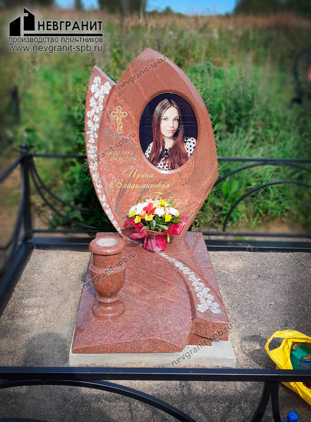 Окутанный тёплым сиянием розового гранита, этот памятник, словно распустившийся цветок, бережно хранит память об ушедшей. Стела, выполненная в форме стилизованного бутона, плавно изгибается, словно тянется к солнцу. В её центре — овальная ниша, в которой размещён цветной портрет молодой женщины. Её взгляд спокоен и исполнен внутренней гармонии. Слева от портрета выгравирован изящный крестик — символ веры и надежды. Ниже — каллиграфическим шрифтом нанесены имя, фамилия, отчество и даты жизни. По бокам стелы, словно нежные лепестки, тянется цветочный орнамент, выполненный в технике пескоструйной обработки. Основание памятника, также выполненное из розового гранита, имеет плавные округлые формы. От него, словно река жизни, извивается дорожка с цветочным узором, ведущая к вазе, расположенной у подножия стелы. Ваза, выполненная в том же стиле, что и весь памятник, уже наполнена яркими живыми цветами, которые привносят в это место памяти нотку радости и надежды. В целом памятник производит