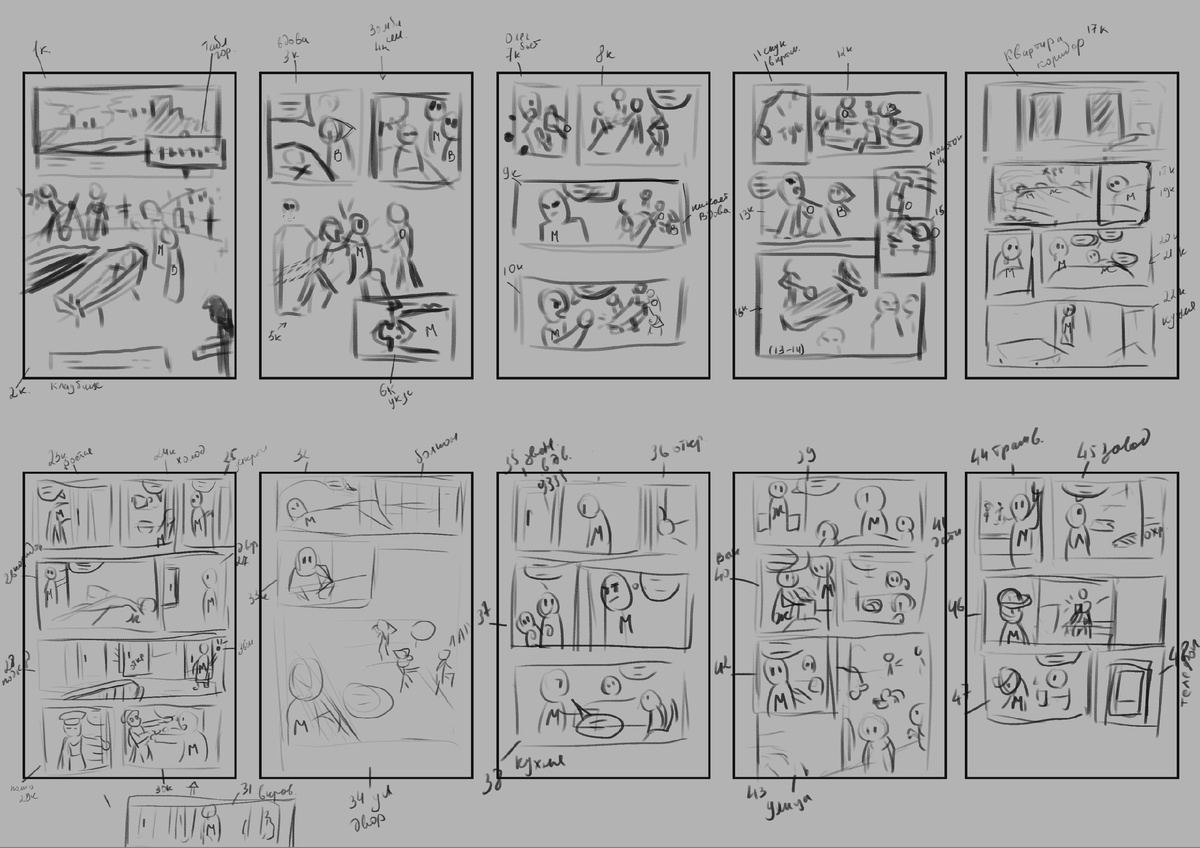 Буквально за один вечер я написал сценарий по рассказу, кстати - тоже, как оказалось, задача не из легких, отправил Анне, она ознакомилась с самим рассказом, со сценарием, ей понравилось и, дабы оценить объем работы, художник сделала раскадровку:
