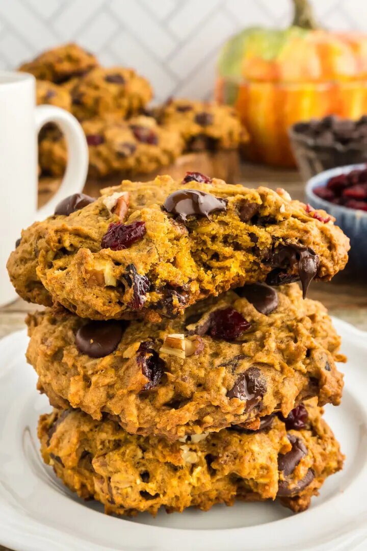 Эти печенья богаты протеином, не слишком сладкие, и я сделал их очень большими, чтобы вы могли взять одно и пойти по делам. Они на вкус как осень, с тыквой, специями, поджаренными пеканами, клюквой и немного насыщенным вкусом какао от темной шоколадной крошки. Они восхитительны!