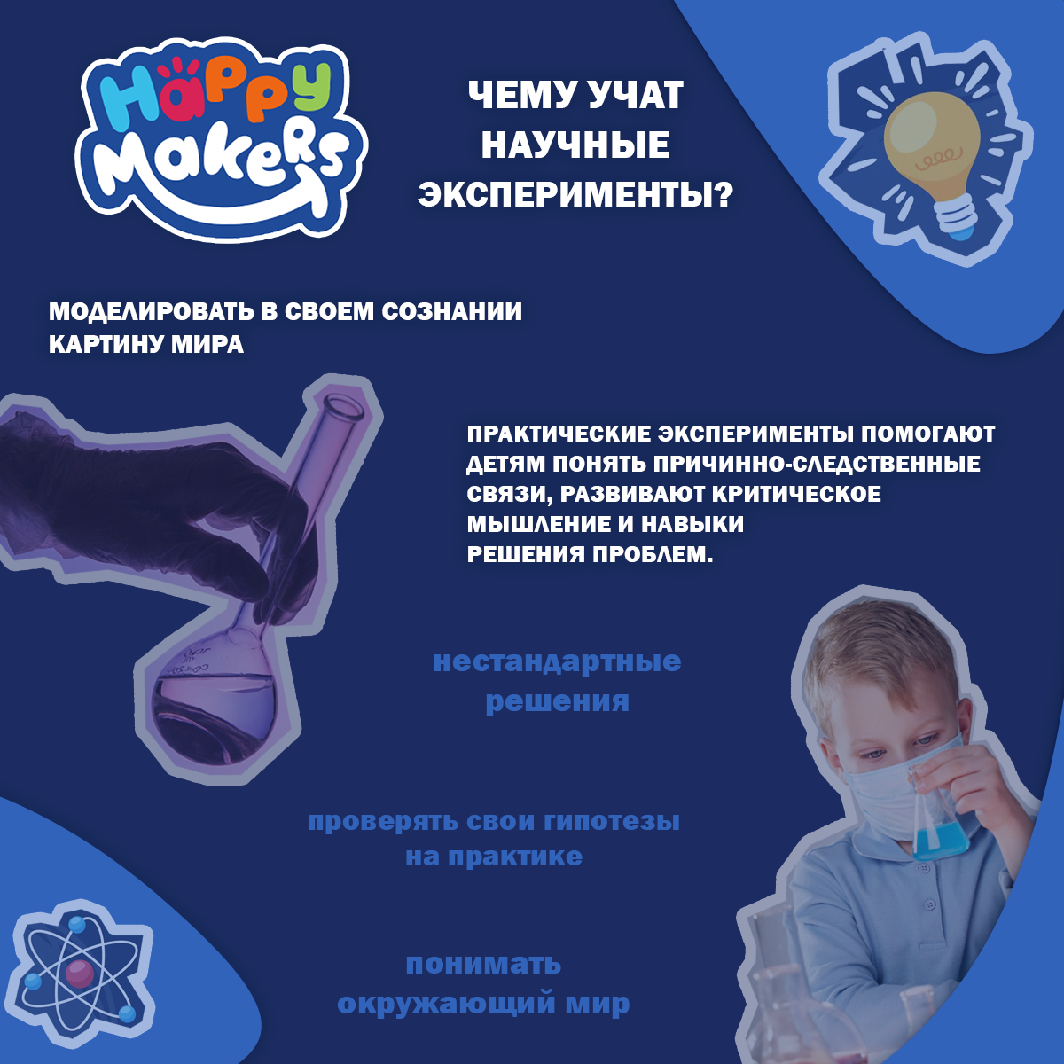 Поговорим о том, как эксперименты могут стать мощным инструментом в развитии вашего ребенка. Вы когда-нибудь задумывались, почему дети так любят задавать вопросы и исследовать окружающий мир? Все просто: эксперименты играют ключевую роль в формировании их мышления и навыков! Зачем детям эксперименты? Эксперименты учат детей анализировать информацию, делать выводы и принимать обоснованные решения. Это помогает им лучше понимать мир вокруг и находить ответы на свои многочисленные "почему?". В дошкольном возрасте экспериментирование позволяет ребенку моделировать в своем сознании картину мира. Они учатся устанавливать взаимозависимости и закономерности на основе собственных наблюдений и опытов. Практические эксперименты помогают детям понять причинно-следственные связи, развивают критическое мышление и навыки решения проблем. Это происходит в увлекательной и захватывающей форме, что особенно важно в раннем детстве. Чему учат научные эксперименты? - Причины и следствия: Дети учатся видеть