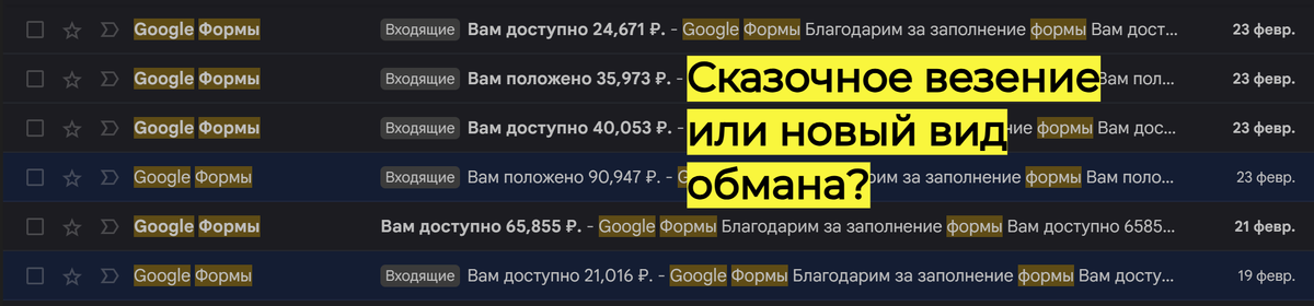 Письмо от Google форм "Вам положено ... ₽." Пробую получить положенное.