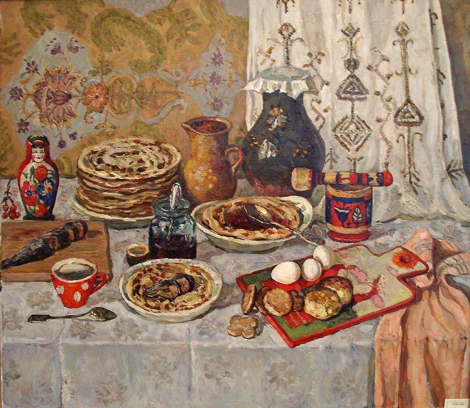 Центральный элемент масленицы и любимое угощение — блины: круглые, золотистые, напоминающие солнце. Многие художники, вдохновленные атмосферой Масленицы, запечатлели на своих полотнах сцены праздничных застолий, где блины занимают почетное место. Зинаида Крохоняткина в своей работе "Русские блины" (1969) обращается к жанру натюрморта, передавая уют и тепло домашнего очага. На ее картине изображен стол, накрытый для масленичного застолья: стопка пышных блинов, сметана, мед и самовар, готовый к чаепитию. Художница акцентирует внимание на деталях, создавая ощущение присутствия и приглашая зрителя присоединиться к трапезе. Виктор Юрьевич Багров, известный своими натюрмортами, в картине "Блины" изображает традиционное русское застолье. На полотне представлены аппетитные блины, украшенные красной икрой, сметаной и зеленью. Теплые тона и тщательно прорисованные детали передают атмосферу домашнего уюта и гостеприимства, характерного для русской культуры. Современный художник Алексей Корабельн