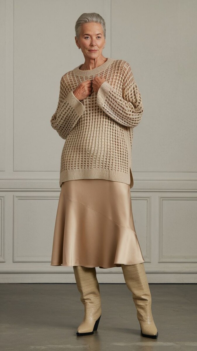 Искусство красиво одеваться способна освоить каждая женщина и в любом возрасте. Модницы в возрасте 60+ тоже умеют подбирать для себя такое образы, в которых будут ловить на себе восхищенные взгляды. Вот 11 самых ярких примеров. 1. Длинное атласное платье-комбинация блестящего бежевого цвета будет уместно и очень эффектно выглядеть на зрелой даме, если дополнить его стильным джемпером-сеткой и высокими сапогами на устойчивом каблуке. И джемпер, и сапоги продолжают монохромную бежевую цветовую гамму образа. Наряд в таких цветах выглядит достаточно ярко и буквально заставляет кожу женщины сиять, делая ее моложе и свежее. 2. Темно-коричневая плиссированная шерстяная юбка длиной до середины лодыжки – уютная и привлекательная вещь, хорошо подчеркивающая привлекательность женского силуэта. Удачный ансамбль с такой юбкой составляет заправленный за пояс тонкий джемпер в белый, светло- и кофейно-коричневый ромбик, из-под которого выглядывают воротник и манжеты белой рубашки. Обувь можно выбрать