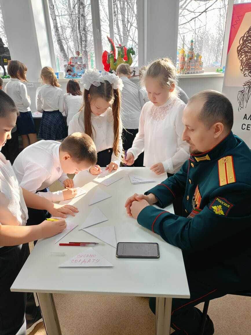 Встреча проходила в формате живой беседы. Ученики задали гостю много вопросов, их интересовало всё – от того, где живут и как питаются солдаты на «линии огня», до реакции на детские письма: получают ли их военные? Гость рассказал школьникам о чувствах, которые охватывают каждого военнослужащего, когда они получают весточки от родных, земляков или письма от совсем незнакомых им детей, написанные от души с пожеланиями скорейшей победы. Ребята передали ему письма для солдат, написанные накануне во время акции «Письмо солдату». «Я восхищаюсь тобой, служба твоя нелегкая, но очень важная для всей страны. Я люблю рисовать, плести из бисера. Занимаюсь плаванием. Мне нравится гулять с друзьями. Очень рада, что могу написать тебе, солдат. Думаю, ты сильный и смелый. Желаю тебе справиться с трудностями. Победа за нами!» - написала Валерия Жерлова в своём письме.