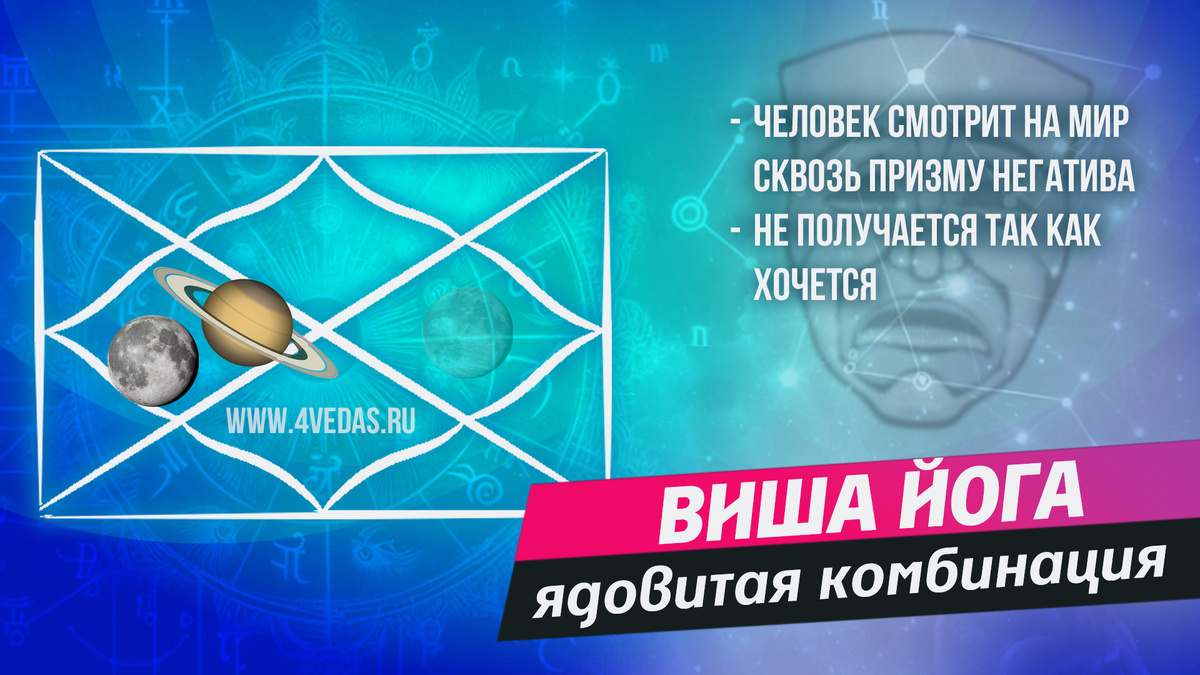 В Ведической Астрологии существует множество комбинаций планет, которые могут влиять на жизнь человека. Одна из самых не простых — это Виша Йога, которая возникает при влиянии Сатурна на Луну. Виша в переводе с санскрита означает "яд". То есть нахождение этой комбинации в натальной карте отравляет жизнь человека. Эту комбинацию можно наблюдать на небе дважды в месяц, и она приносит с собой стресс и внутреннее напряжение. Но что же происходит, если такой аспект заложен в натальной карте человека?