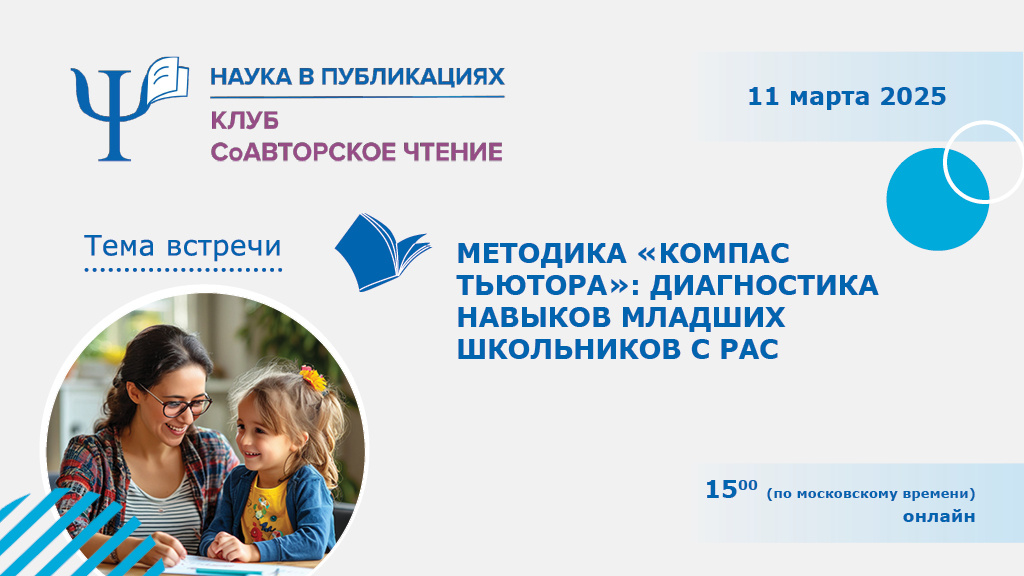 11 марта 2025 года при поддержке Точки кипения МГППУ состоится встреча читательского клуба «СоАвторское чтение» из цикла «Наука в публикациях». Тема клубной встречи – «Методика «Компас тьютора»: диагностика навыков младших школьников с РАС». «Компас тьютора» – это инструмент оценки навыков, предназначенный для составления индивидуальной программы коррекционной работы обучающегося с расстройствами аутистического спектра (РАС) и контроля динамики ее результатов. Авторы методики расскажут о самой методике и возможностях ее применения в работе с младшими школьниками с РАС, а также ответят на следующие вопросы: Спикеры также расскажут о результатах первичной апробации инструмента, которая проходила на базе школьно-дошкольного отделения Федерального ресурсного центра по организации комплексного сопровождения детей с расстройствами аутистического спектра МГППУ (ФРЦ РАС МГППУ). Спикеры: Давыдова Елизавета Юрьевна, кандидат биологических наук, доцент, ведущий научный сотрудник Федерального ресу