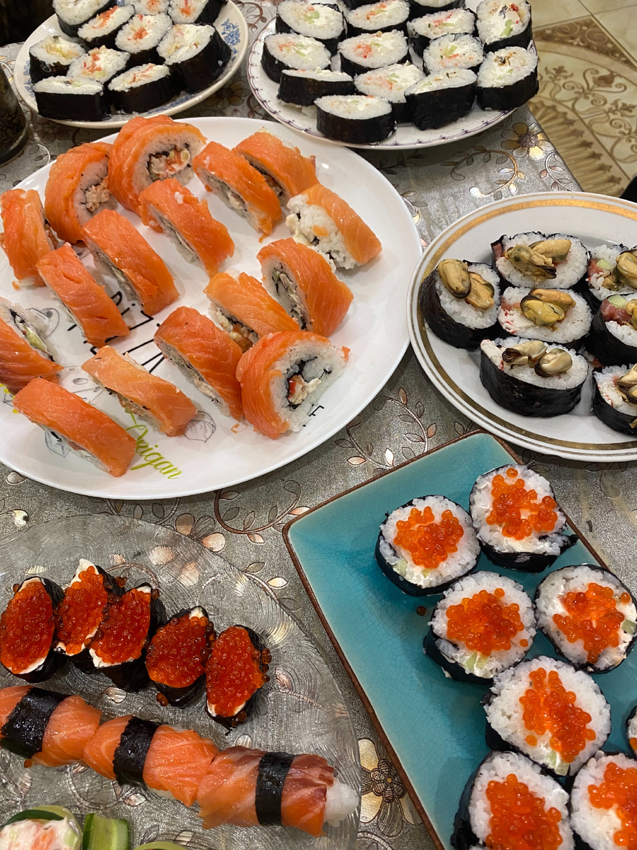 Как их крутить , я посмотрела в интернете . Меня волновала начинка , так как у отца диабет, и там все ограниченно . Попросил вот приготовить роллы простые , из известных нам продуктов . И чтоб как можно было мало в них сахара . И в сиропе я исключила сахар . Они получаются пресными . Но когда ты питаешься с ограничениями , ты привыкаешь , и чувствуются другая вкусовая гамма . Начинка : сыр , огурчик , рыбка , коктейль из морепродуктов в масле , все это совмещала по нашим предпочтениям . Украшала некоторые икрой .