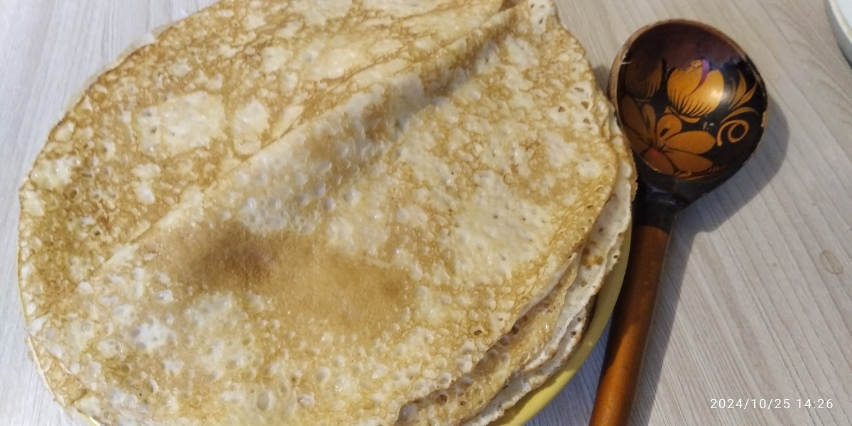 По вашей просьбе , друзья! Рецепт тонких блинчиков . 500 мл молока 2 яйца 200 мл воды 0,5 ч.л.соли Сахар по вкусу ( 2- 4 ст.л.) Разрыхлитель чуть-чуть ( можно без него) Ванилин (на кончике чайной ложки ) Подсолнечное масло 3 ст.л. Мука 1,5 - 2 стакана. Сначала в чуть теплое молоко вбиваем яйца, сахар, соль, ванилин. Всыпаем полтора стакана муки. Делаем однородное тесто. Дальше доводим его до консистенции с помощью воды. Густота как у жидкой сметаны. Я по первому блинчику смотрю , если толстые блинцы, то разбавляю ещё. В конце добавляем подсолнечное масло и разрыхлитель . Пробую вкус. Если надо, то добавляю соль и сахар. Даю массе постоять с полчаса. Сковородку прокаляю. Наливаю немного масла. Пробую испечь первый блинчик. И дальше смотрю. Если толстовато получается, то разбавляю водой ещё. Смазываю маслом сковороду через раз. Блинчик обжариваю с двух сторон . Со второй стороны только символически подсушиваю. Каждый готовый блинчик смазываю сливочным маслом. Вообще точных граммовок дл