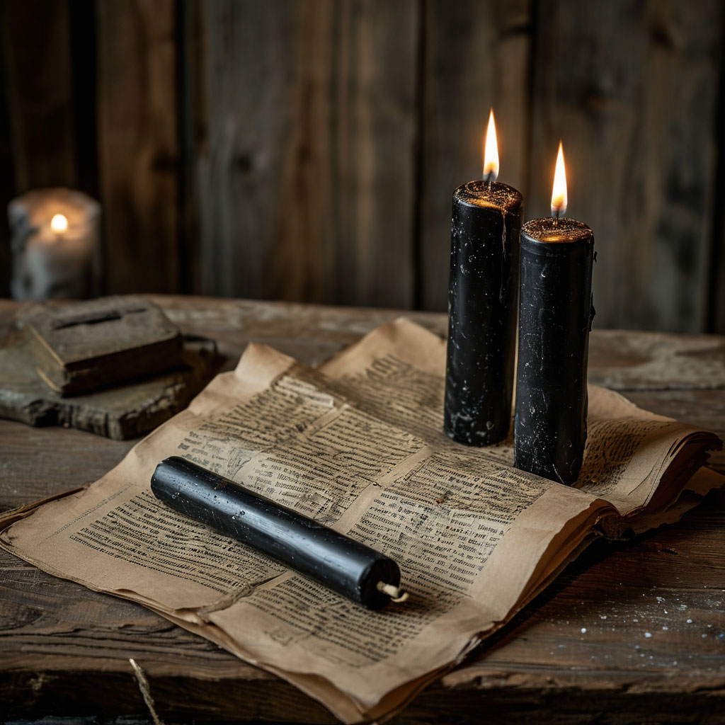 - Три черные свечи, отлитые из воска, смешанного с пеплом неведомых существ. Их пламя, холодное и мерцающее, отбрасывает тени, которые движутся вопреки законам природы.