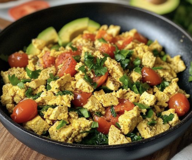 Тофу богат высококачественным растительным белком (до 14 % в плотном, до 9 % в мягком тофу), который содержит все незаменимые аминокислоты, а также является источником омега 3 жирных кислот при общем низком содержании жира (3-4%), источником железа, кальция, многих витаминов и микроэлементов. Для приготовления этого блюда вам понадобятся следующие ингредиенты: Процесс приготовления: 1. Нарежьте тофу крупными кусочками, переложите в чашу блендер с S-образным лезвием и измельчите в крошку. 2. Разогрейте на среднем огне сковороду, добавьте оливковое масло и обжарьте мелко нарезанные лук и чеснок в течении 1-2 минут. Добавьте мелко-мелко нарезанные соцветия брокколи и порезанные на четвертинки помидоры черри. Перемешайте, накройте крышкой и обжаривайте 5 минут, иногда помешивая. 3. Добавьте овсяное молоко, измельченный тофу, соль и специи. Хорошо перемешайте, чтобы специи равномерно покрыли тофу. Проверьте брокколи - к тому моменту она уже должна легко прокатываться вилкой. Если нет, потом
