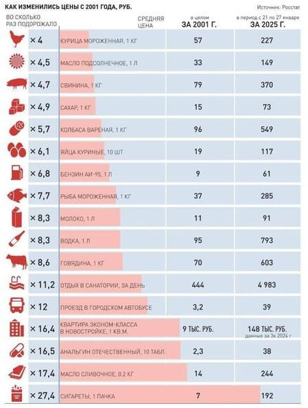 Недавно в сеть вышла рекомендация по способу заработать на пенсию в размере 110.000 ₽. С января 2025 года страховые пенсии выросли аж на 7,3%. Бабки на лавках теперь только и задаются вопросом: «Как же потратить повышенную пенсию?». 🤑 Первый ответ напрашивается сам собой — никак. Но мы будем разбираться. Вначале поднимем глаза ☝️ на приложенное изображение и глянем как изменились цены с 2001 года на 2025 год. Самое главное то, что сигареты подорожали в 27 раз. Это хорошие новости. Теперь к плохим. Всё остальное подорожало тоже. Сливочное масло аж в 17,4 раза. Водка в 8,3 раза. Прямо как и молоко. Хотя казалось бы… Однако нужно отдать и должное зарплатам. Медианная зарплата по годам (средняя по годам) тоже выросла: ▫️2001: 1.700 (средняя 3.240)