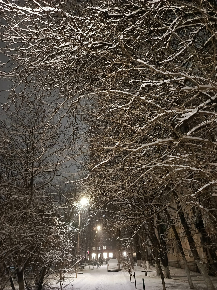 Снегопад начался поздно вечером. Снег шёл крупными, снежными хлопьями. Ветра не было, и снежинки медленно, кружась словно в танце, двигались в воздухе, оседая на деревья, дома, машины... Некоторым снежинкам особо повезло - их танец освещался уличным фонарём, словно ярким софитом на выступлении известного танцевального коллектива. Кружась в его свете, снежинки переливались, сияли и мерцали... Иногда снежинки попадали прямо в расставленные для них ладошки и широко раскрытые рты детей, которые при этом весело и заливисто смеялись. Впрочем, большинству снежинок всё таки удавалось достичь земли, чтобы уютно расположиться среди других таких же, покрывающих сугробами всё вокруг. Несмотря на поздний вечер, на улице, во дворе дома, было многолюдно - смех, негромкие разговоры, дети и взрослые просто и искренне радовались этому, далеко уже не первому, но такому прекрасному снегу. Кто-то вынес на улицу колонку и вдруг заиграла музыка - лёгкая и мелодичная, делая атмосферу вокруг ещё более необы