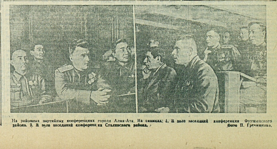 В этот день, 25 февраля 1945 года, газета «Казахстанская правда» публикует фотографии участников Х Алма-Атинской партийной конференции, а также отчёт о ней. На снимках: 1. В зале заседаний конференции Фрунзенского района. 2. В зале заседаний конференции Сталинского района. Фото П.Гречищенко. «Вчера начала свою работу Х Алма-Атинская городская партийная конференция. Открывая конференцию, секретарь горкома тов. Шмельков говорит об организаторской работе, проведённой партийной организацией в годы войны, о боевых задачах, стоящих перед большевиками столицы Казахстана. - Четвёртый год идёт священная Отечественная война народов Советского Союза против немецко-фашистских извергов. Близок день окончательной победы. С гордостью за наш героический народ, за наши вооружённые силы мы повторяем исторические слова февральского приказа товарища Сталина: «На четвёртом году войны Красная Армия стала крепче и сильнее, чем когда бы то ни было, её боевая техника стала ещё более совершенной, а боевое масте