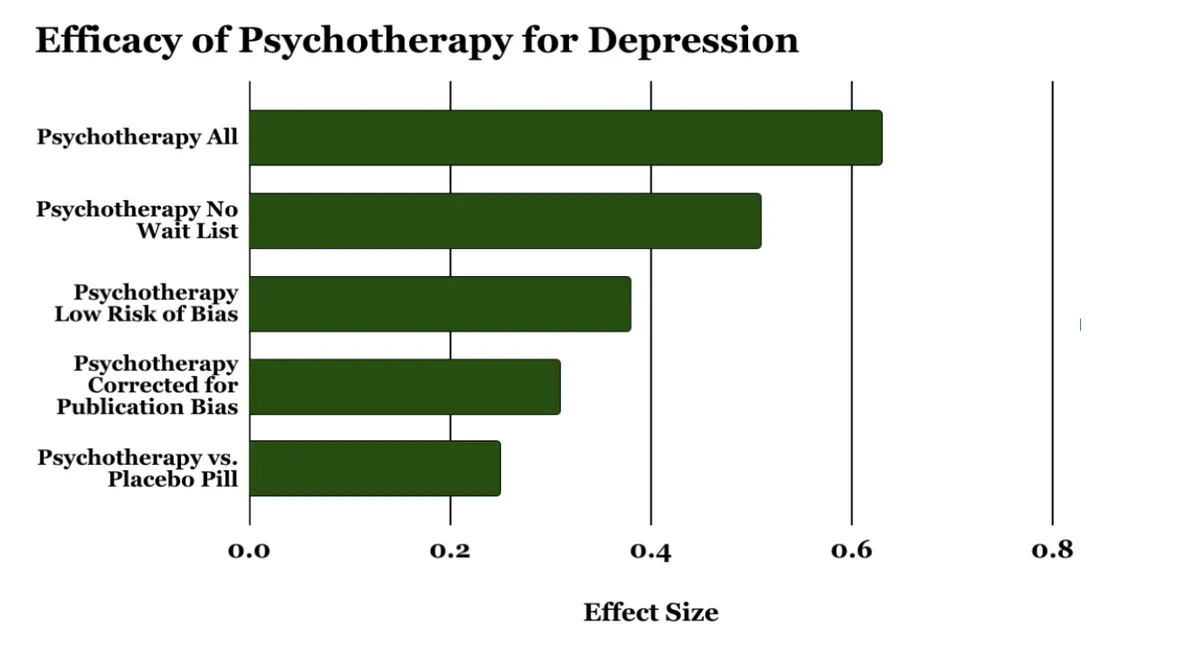Недавние мета-анализы в целом показывают размеры эффекта в интервале от 0,5 до 0,9, т.е. между умеренным и крупным. Кроме того, и пожалуй удивительно, частная модальность или тип психотерапии (т.е., когнитивно-поведенческая, психодинамическая, межличностная и т.п.) по всей видимости не играет роли. Размеры эффекты одинаковы для добросовестных психотерапий. Однако, большинство исследований сравнительной эффективности недостаточно мощны (статистически), чтобы обнаружить клинически значимые различия, так что эти данные стоит толковать с осторожностью. На текущий момент, впрочем, свидетельства в пользу специфических эффектов модальностей скудны.