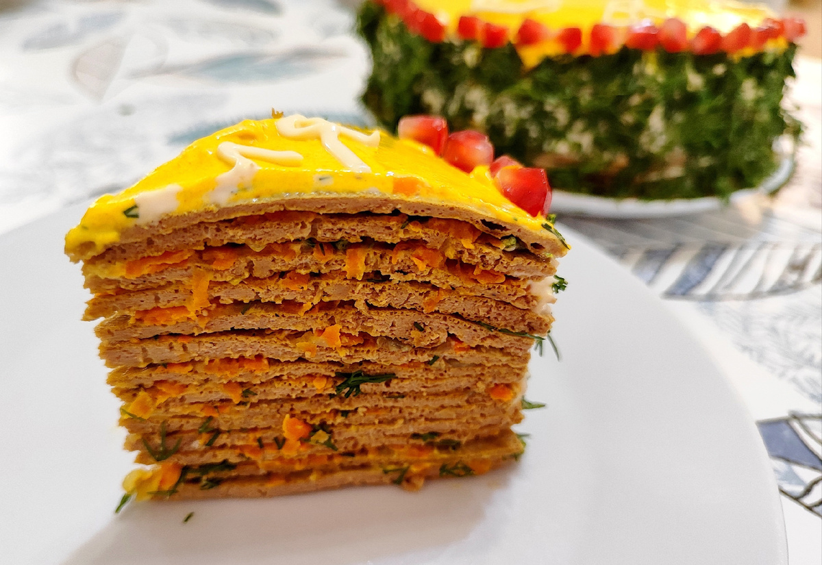 Рада приветствовать Вас на моём канале! Печёночный торт как правило готовят из говяжьей или куриной печени. А добавить новые нотки можно с помощью грибов, картофеля, маринованных огурцов, чеснока, специй, зелени. Соус - это обычно майонез, можно к нему добавить чесночок, но некоторые готовят из сметаны или несладкого йогурта. Для украшения подойдут яйца, натёртые на мелкой тёрке, а также сыр, помидоры, укроп, петрушка, гранат и др. Рецепт: 1) Печень помыть и откинуть на сито, чтобы стекла лишняя вода. 2) Перебить печёнку в блендере. Я перебивала за 2 захода, т.к., он у меня маленький. 3) Переложить в миску, добавить яйца, соль, перец, муку, растительное масло и всё перемолоть в погружным блендером до однородности. 4) Для первого блина немного смазать сковороду растительным маслом (перед последующими блинами смазывать не нужно, если у вас антипригарная сковорода). Жарить блины на огне чуть ниже среднего с обеих сторон до готовности. Переворачиваем тогда, когда блинчик поменял свой ц