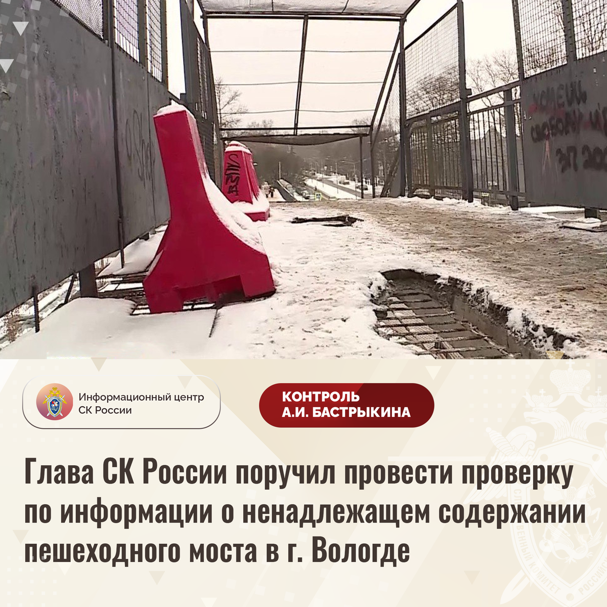 Глава СК России поручил провести проверку по информации о ненадлежащем содержании пешеходного моста в г. Вологде В СМИ сообщается о ненадлежащем содержании пешеходного моста через железнодорожные пути по улице Текстильщиков в городе Вологде. Социально значимый объект, расположенный вблизи образовательных и медицинских учреждений, находится в аварийном состоянии: в его конструкциях образовались трещины и сквозные провалы. Многочисленные обращения в компетентные органы результатов не принесли, мер к организации проведения ремонтных работ не принимается. Председатель Следственного комитета Российской Федерации Александр Иванович Бастрыкин поручил руководителю СУ СК России по Вологодской области Геннадию Юрьевичу Яшину провести процессуальную проверку и доложить о ее предварительных и окончательных результатах. Исполнение поручения, а также ход процессуальной проверки поставлены на контроль в центральном аппарате ведомства. #СледственныйКомитет #СКРоссии #СКР #ИЦСКР #Информационныйцентр #