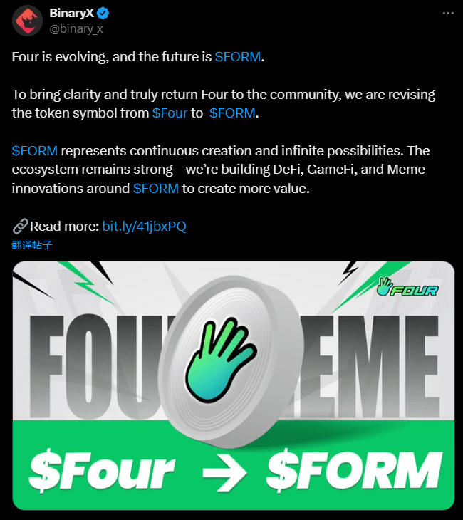 Согласно официальному заявлению, BinaryX изменила символ токена с $FOUR на $FORM, имея за собой четкие стратегические соображения. С момента запуска платформы справедливого распределения Four.Meme 3 июля 2024 года компания BinaryX содействует активному развитию культуры мемов в экосистеме сети BNB. Однако в ходе этого процесса $Four, как популярный символ токена Meme, широко использовался во многих проектах, и даже многие токены носят название «Four», что внесло путаницу в сообщество.
