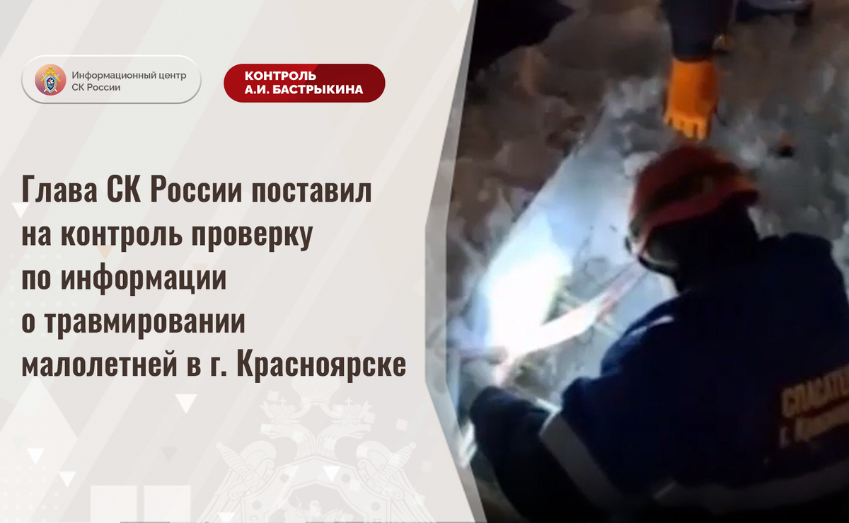 Глава СК России поставил на контроль проверку по информации о травмировании малолетней в г. Красноярске В СМИ и социальной сети сообщается, что 22 февраля текущего года в городе Красноярске 13-летняя девочка упала в заброшенный открытый подвал. Помощь ребенку оказали сотрудники службы спасения. В ГСУ СК России по Красноярскому краю и Республике Хакасии по данному факту организована процессуальная проверка. Председатель Следственного комитета Российской Федерации Александр Иванович Бастрыкин поставил ход процессуальной проверки на контроль в центральном аппарате ведомства и поручил и.о. руководителя ГСУ СК России по Красноярскому краю и Республике Хакасии Дмитрию Сергеевичу Вастьянову представить доклад о ее промежуточных результатах и принятом по итогам решении. #СледственныйКомитет #СКРоссии #СКР #ИЦСКР #ИнформационныйЦентр #АлександрБастрыкин #ПредседательСКР #КонтрольПредседателяСКР #КомментарийКонтроль #КрасноярскийКрай
