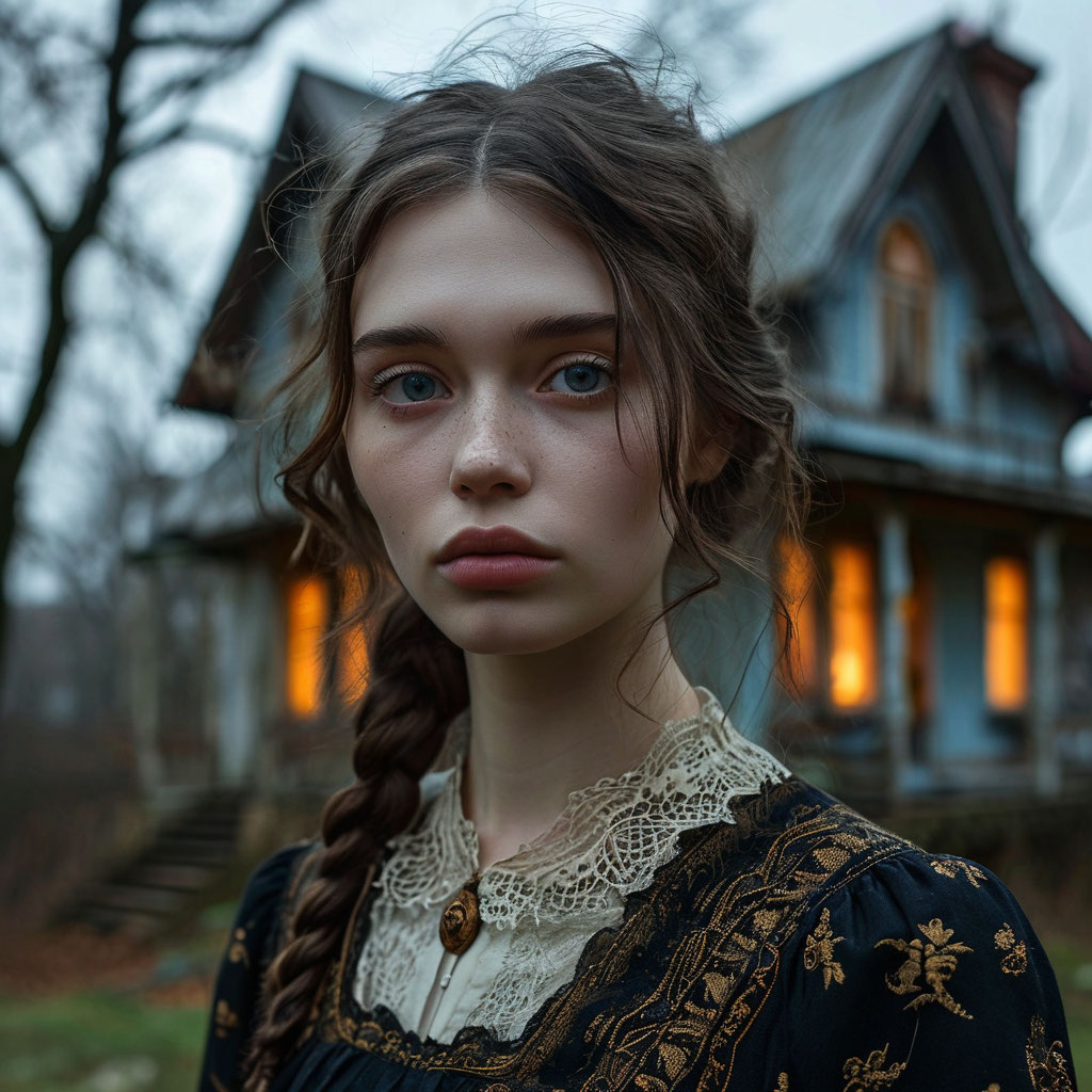 Однажды ночью Ольга проснулась от ощущения чьего-то присутствия в комнате. Открыв глаза, она увидела женскую фигуру, стоящую у кровати. Лунный свет, проникающий через окно, создавал вокруг силуэта странное сияние. Женщина была одета в длинное темное платье старинного покроя, ее волосы — черные, блестящие — струились по плечам. Лицо ее было прекрасно — бледное, с высокими скулами и полными губами. Но глаза... глаза были полностью черными, без белков, словно пустые глазницы, заполненные тьмой.