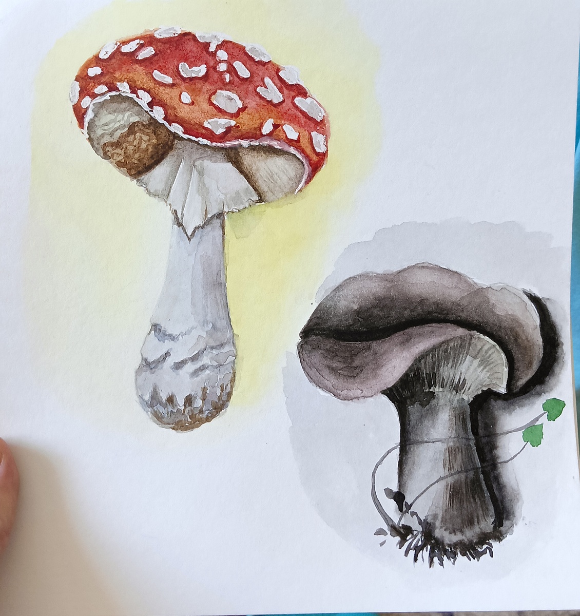 Мои грибочки липкие и имеют блеск. Больше одного слоя акварель не выдерживает, больше двух слоёв не выдерживает бумага.